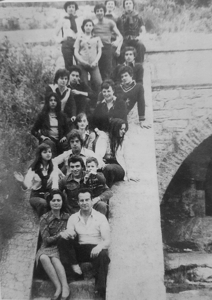 Ecco, ridere, uno degli intenti, negli anni, che ho seguito in tutte le mie commedie dialettali, risate, però, non fini a sé stesse, ma propedeutiche ad una morale che rispecchiasse tutti gli aspetti sociali del nostro vivere comune. Nella prima “rosa” di attori troviamo, tra gli altri riconoscibili nella foto, Guido Bernardi, Gino Ricci, Augusto Del Ferraro Roberto Bernardi, Luigi Lana. A questi si aggiungerà, in seguito, l’appena tredicenne Mena Balestra. In una foto successiva, che ci ritrae sulla scalinata dell’ “acqua ‘nzurva”, si scorgono personaggi che già costituivano l’essenza della “Compagnia” di allora. Dopo i primi risultati, man mano, il Gruppo ha assunto sempre più l’aspetto di una Compagnia teatrale. Per me, che ho sempre amato ed amo il teatro, l’allora nuova costituzione del Gruppo sarebbe stato lo sbocco naturale e le basi per le innumerevoli rappresentazioni, sempre seguite ed apprezzate dal pubblico, con il nostro dialetto, che ha riscosso ampi consensi non soltanto a Cori, ma ovunque venisse proposto.