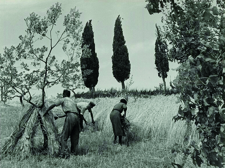 Parlando con le persone anziane del paese, si scopre che negli anni ’50 la raccolta del grano, a differenza di oggi che è tutto meccanizzato, avveniva a mano ed era un lavoro che impegnava molte persone. Alla raccolta partecipavano uomini, donne e bambini, ognuno con un ruolo ben preciso. Il lavoro durava dall’alba al tramonto e la fatica sotto il sole di luglio era notevole. Un primo gruppo, disposto in file ordinate, tagliava il grano a forza di braccia con la falce ben affilata; seguiva un secondo gruppo, solitamente composto da donne e bambini, che raccoglievano le spighe tagliate legandole a fascine; infine, un terzo gruppo formava i cosiddetti “covoni”, fasci di grano legati in modo da agevolare la trebbiatura. I covoni venivano posizionati con le spighe di grano rivolte verso l’alto affinché potessero essiccarsi al sole nei giorni successivi alla mietitura. Il compito delle ragazze, oltre a dare una mano nei campi, era anche quello di portare brio con la loro bellezza, rinfrescando i lavoratori con acqua, vino e merende casarecce, servite all’ombra delle gigantesche querce situate nella parte perimetrale dei campi.