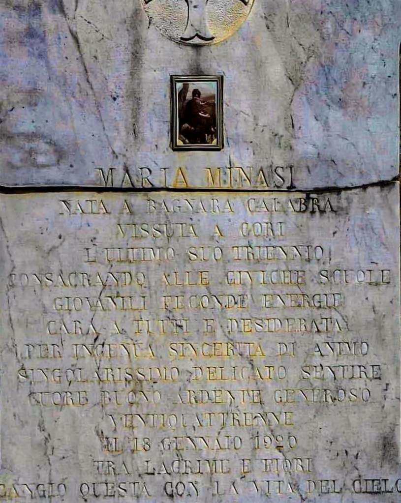 La sua tomba e la lapide, dopo cento anni, sono state demolite. Il mio dolore è stato immenso quando ho appreso questa errata decisione. Grande, credo deve essere stato lo stupore di mia madre e della stessa Maria che vivono nella profonda coscienza dell’universo dove non so se possano esistere sentimenti di legittima sofferenza per quanto accaduto. Sulla lapide distrutta si leggeva: “Maria Minasi/Nata a Bagnara Calabra/Vissuta a Cori/L’ultimo suo triennio/Consacrando alle civiche scuole/Giovanili feconde energie/Cara a tutti e desiderata/Per ingenua sincerità di animo/Singolarissimo delicato sentire/Cuore buono ardente generoso/Ventiquattrenne/Il 18 gennaio 1920/Tra lagrime e fiori/ Cangiò questa per la vita del cielo”. Dopo la distruzione della tomba gliene è stata di recente dedicata un’altra con una sobria lapide che forse bisognerebbe sostituire ripristinando la scritta originaria.