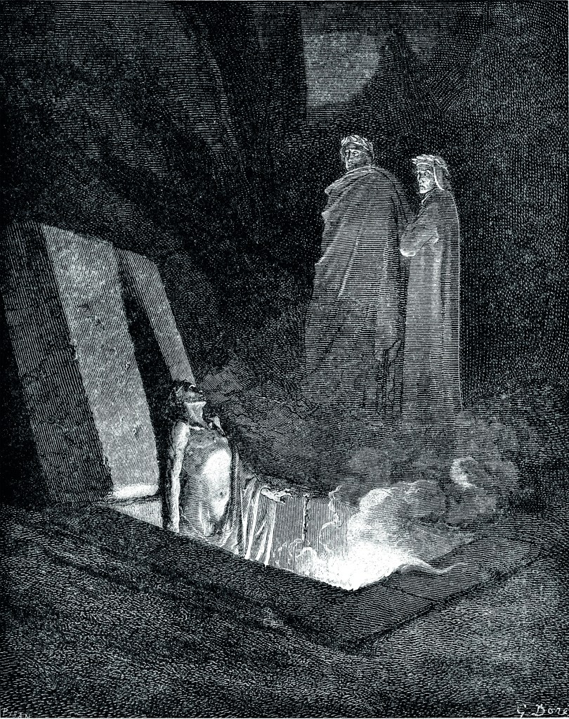 Dante colloca Farinata tra gli epicurei nel sesto cerchio dell’Inferno, sepolto in una tomba infuocata, simbolo di un’eternità di sofferenza. Il suo volto, alto e fiero, emerge tra le fiamme, a sottolineare l’imperturbabilità e l’orgoglio di un uomo che non abbassa lo sguardo nemmeno di fronte alla propria pena eterna. Nel dialogo che segue, Farinata si rivolge a Dante con il tono di chi vuole mantenere la propria dignità: parla con severità, si informa del destino dei suoi cari e prevede il futuro esilio di Dante stesso, dimostrando una visione limitata al presente e al futuro prossimo, perché a lui, come a tutti gli altri dannati, è preclusa la conoscenza del tempo futuro dopo il Giudizio Universale.